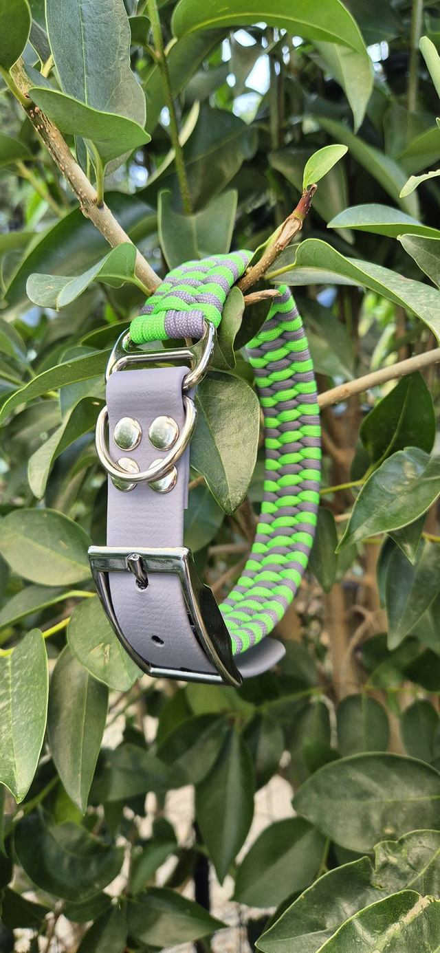 🎨 Ce collier tressé à la main combine le pep's du Vert Néon et le Gris Smoke élégant.